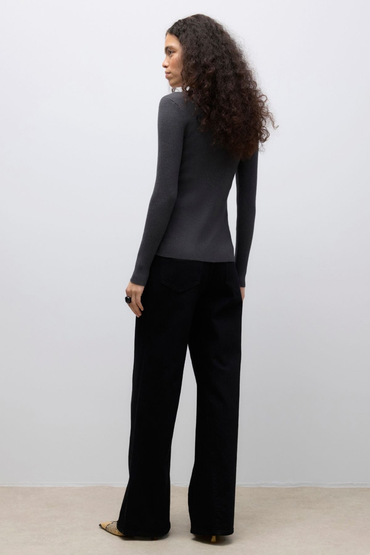 Hienostunut Melange -neule: Tummanharmaa Melange kudonta lisää visuaalisen tekstuurin ja tyylikkään, modernin kosketuksen tähän välttämättömään kappaleeseen.
