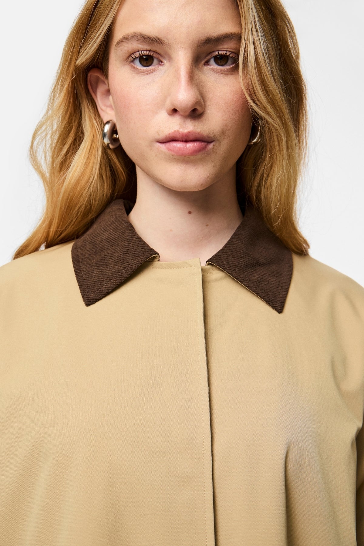 Tämä takki on valmistettu harkitusta materiaalien sekoituksesta, mukaan lukien 51 % kierrätettyä polyesteriä, ja se on askel kohti kestävämpää tulevaisuutta. Kangas tuntuu sileältä ihoa vasten ja tarjoaa erinomaisen kestävyyden varmistaen, että sijoituksesi kestää kaudesta toiseen. Travertine Hot Fudge -väri tarjoaa upean beigen neutraalin, joka täydentää mitä tahansa asua ja tekee siitä monipuolisen lisäyksen kapselivaatekaappiisi.